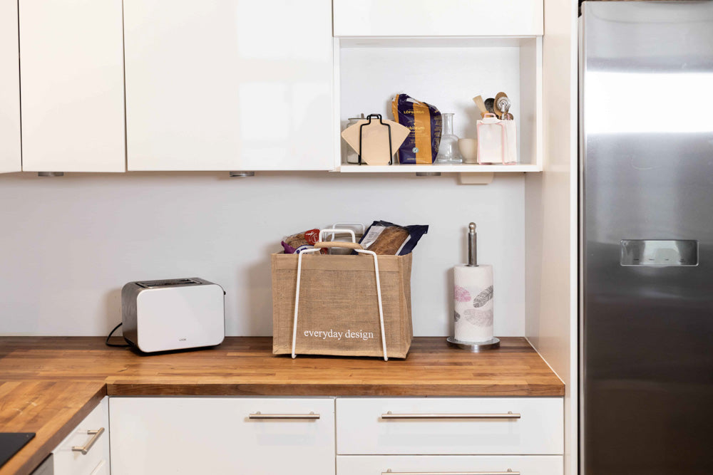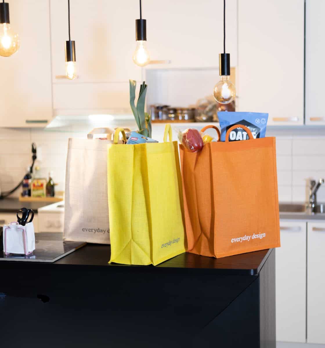 Kyllä voi! HELSINKI-teline suunniteltiin aikoinaan kaupan paperikassien kanssa käytettäväksi ja ne sopivat siihen oikein hyvin. Juuttikassit tulivat valikoimaan asiakkaiden pyynnöstä, sillä he eivät tykänneet kauppojen paperikassien ulkonäöstä. Myös muita kasseja voi käyttää HELSINKI-telineen kanssa.