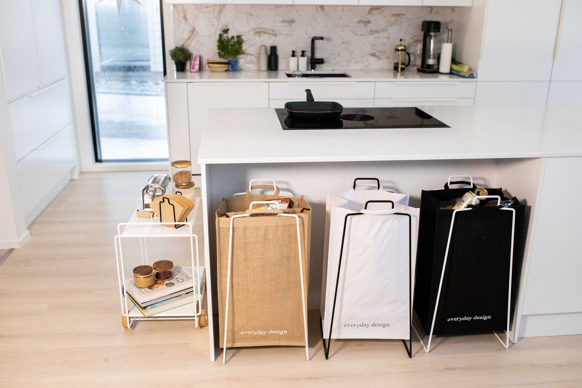 Kätevä ja kaunis lajittelupistettä kierrätystä helpottamaan. Kahdella HELSINKI-telineellä ja kolmella juuttikassilla saat tyylikkään ja helppokäyttöisen kierrätyspisteen kotiin, mökille tai vaikka toimistolle.