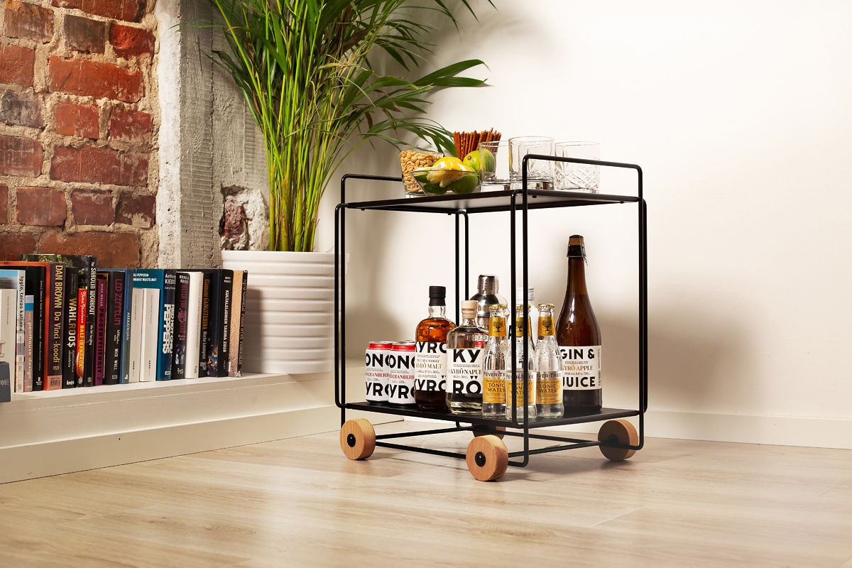 Monipuolinen ja ajaton TAMPERE -tajoiluvaunu sopii hyvin olohuoneeseen. Pienet yksityiskohdat kuten puupyörät ovat käytännölliset sekä kauniit.